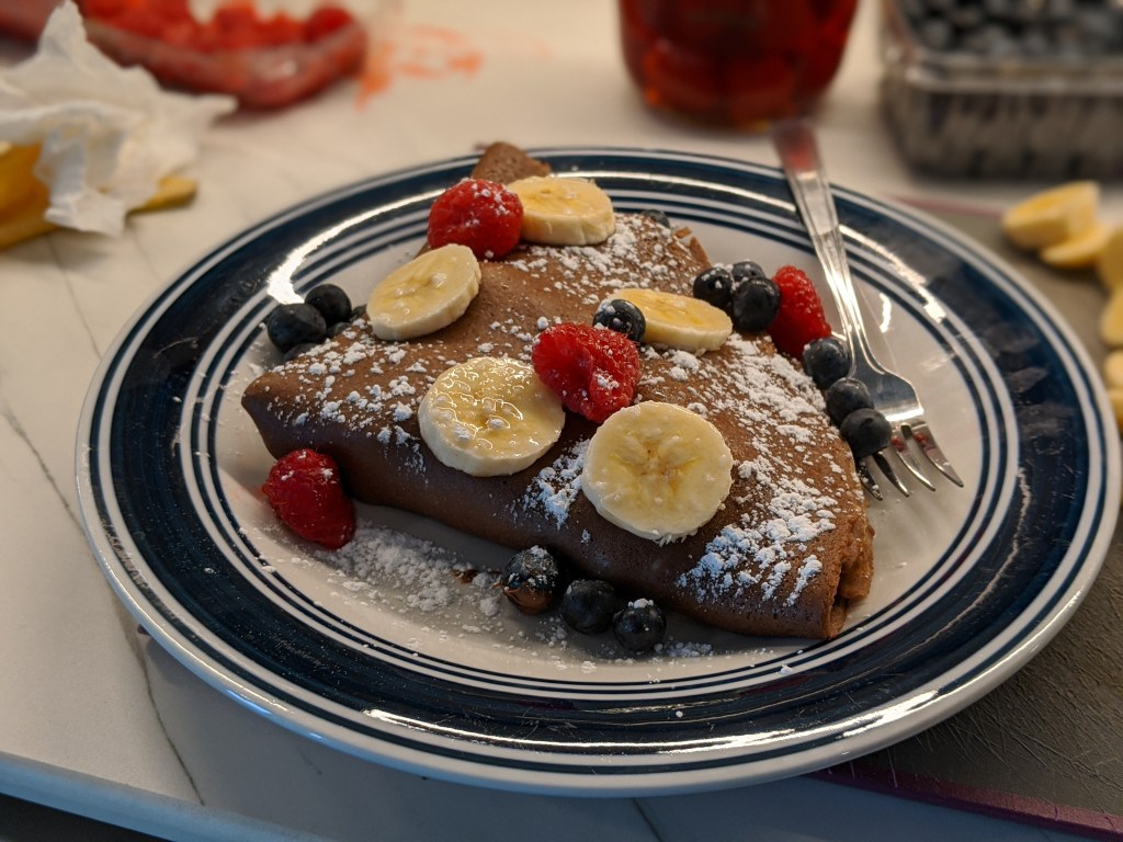 JC: So, the regular crepe recipe tells you to use normal milk. I like to use chocolate protein almond milk, which gives it more of a sweet taste and also helps with the taste of Nutella in it. And the fruit on top so it gives more of a sweet taste to that sweet crepe.