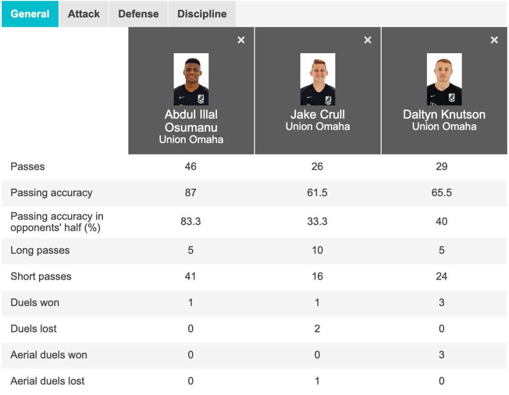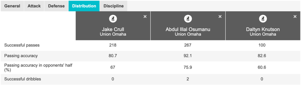 However, from the data above I think a few things stand out. One, it is hard to argue Jake had a good game (I love you Jake, sorry to write that). His passing accuracy was 20 percent off his season average. He completed 3 in 5 passes instead of his usual 4 in 5 passes. He lost several duels as well. Two, Daltyn, wasn’t particularly accurate either, but did win all of his duels. Three, Illal had another rock solid game.