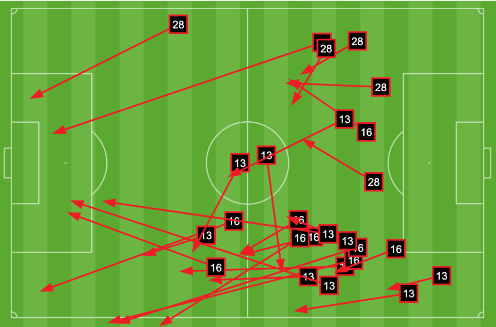 The unsuccessful passes chart for our center backs shows what the overall passing accuracy numbers do, our left center backs had a rough game.