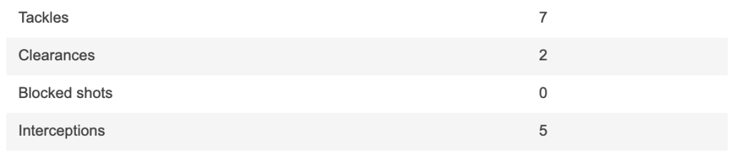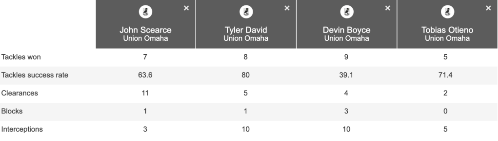 Those are eye popping, to be honest. I didn’t include offensive stats since they were all zeros, but in terms of defensive effort, wow. Let’s compare Toby to our three fantastic midfielders.