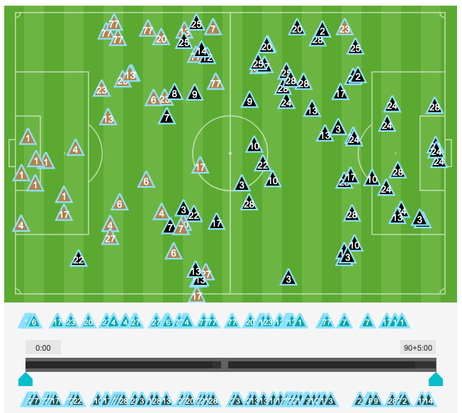 One other thing I considered was the possibility we piled up those stats in the final 30 minutes of the game, when we had to chase a result. But as you can see from the chart above, the rate of recoveries dropped slightly, but not dramatically after the 60′.