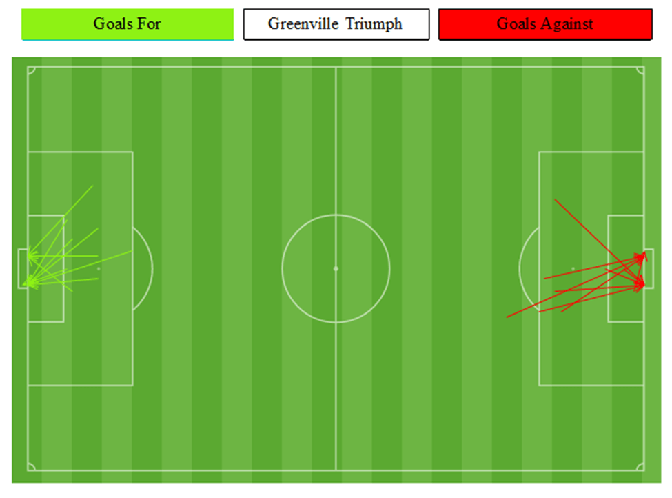 This is a diagram of the goals they’ve scored and the goals they’ve allowed so far this season. If you look at the left side, the goals they’ve scored, you’ll see that most of their goals are coming from the right side of the attacking penalty spot. On the other side of the field, you can see that most of their goals come from the left side of the penalty spot in their defensive third. This does seem to match the norms of attacking tendencies from soccer teams, since most teams have their best attacker lining up on the right side of the field, but you should also consider Greenville’s secondary threat: chance creators.