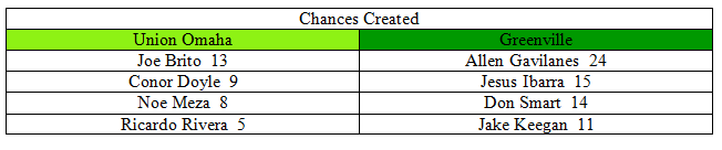 Greenville has four players in double digits for chances created and three of them are higher than Union Omaha’s highest chance creator:
