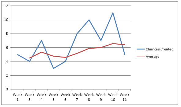 Having four players in double digits for chances created is bad enough for the opposition, but the way these four have played over the past five games is downright scary. Look at this graph for proof of their growth: