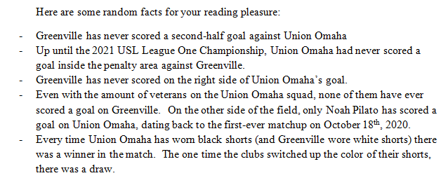 Though these two clubs have only played each other on four separate occasions, there’s rich history between the two sides. We all know about the championship-that-wasn’t-to-be from 2020. In 2021, these two teams were the first USL League One teams featured on a national broadcast (ESPN2). At the end of 2021, the two clubs were the last survivors in the league and Union Omaha capitalized on the moment to win the Championship at home 3-0. Union Omaha seems to be copying Greenville’s history in a way: both have a championship and both have qualified for the Championship each year they’ve been in USL League One.