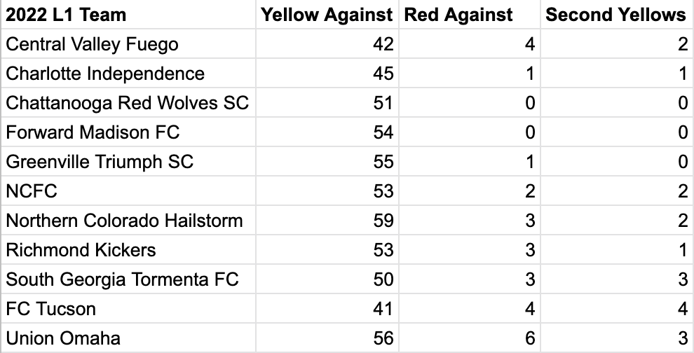 There was another red card for an opponent this game. It has seemed that that situation has happened a lot this season … right? Yes! In fact, the 6 red cards against us this season is more than anyone else in the league has against them. Some of them have been straight reds (apparently the one from Tucson recently was a straight red? It seemed a second yellow from the berm), but many of them may be attributed to the large amount of yellows against us this season. We have the 2nd most yellows against us despite having at least 1 less game played than every other team. So that might play a hand in why there have been so many reds against us. It definitely did in this last game, as of the 3 yellows given to the opposition 2 were against the same player which resulted in the red card. The updated list as of the end of July for the whole league is below, where you can see how much of a disparity there is among the teams: