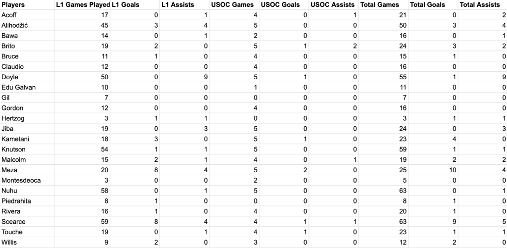 Kevin’s goal was indeed incredible, in only his 8th game for the club as well. I wanted to highlight a few other milestones below, but here is the full appearance/goal/assist table if you are curious: