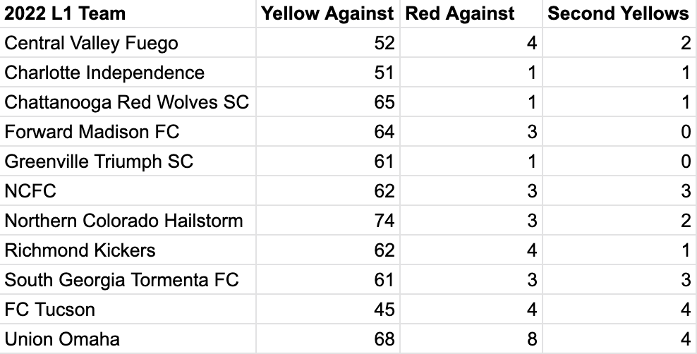 So… we have a lot of red cards against us this year. Those two from Saturday put us at 8 total reds against us this season. That’s double the next teams’ amount! As shown in the table below: