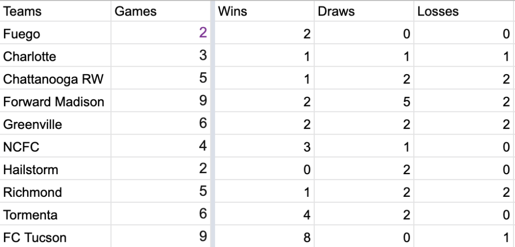 That means we have winning records against 4 teams (Fuego, NCFC, Tormenta, and Tucson), tied against 4 teams (Charlotte, Madison, Greenville, and Hailstorm*), and losing against 2 teams (Chatt and Richmond). Richmond had been even before last weekend and there is still a chance to even it back up this season. And Chatt… is our next opponent. So there is a possibility we could even up both Chatt and Madison in the same week. It would require a win against a surging side at the end of another tough 3-game stretch, but it’s possible.