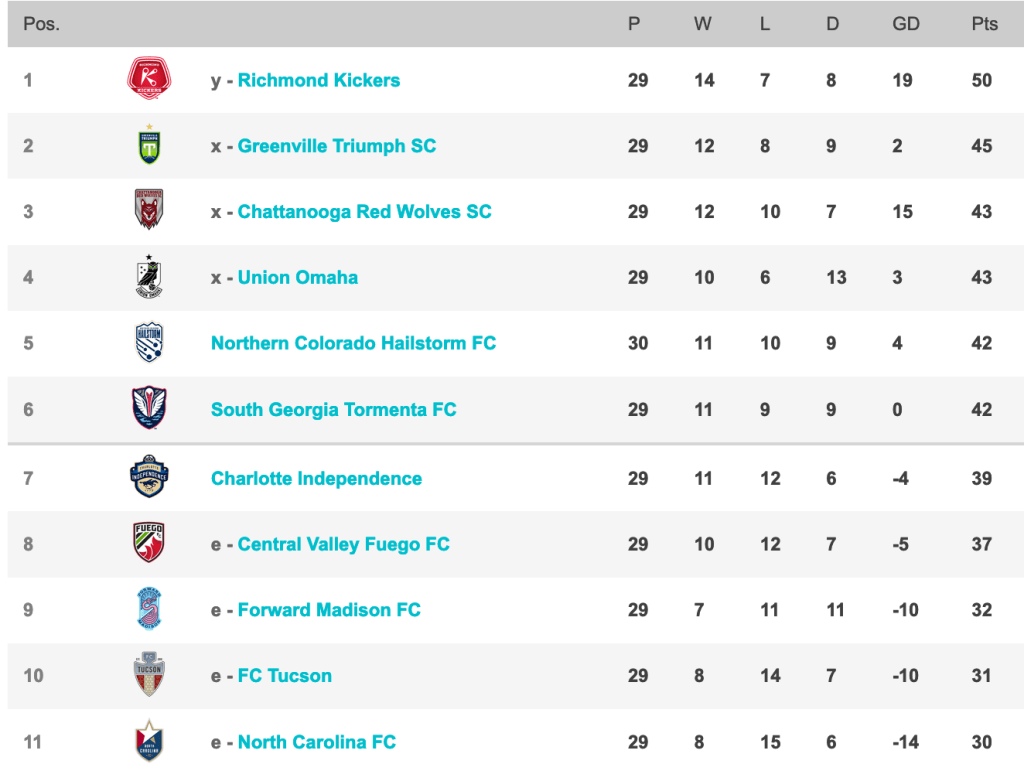We can finish anywhere between 2nd and 5th. Fortunately, Chatt and Tormenta play one another on the final day. So a loss plus a Tormenta win is the only way we slip to 5th. A draw guarantees us at least 4th, with 3rd being possible with a Tormenta win. A win is the only thing that at least guarantees us a shot at 2nd and would greatly improve our chances for at least 3rd. The trouble with 2nd is that Richmond and Greenville play with Richmond having already clinched. One could see them resting some players (as we did last season) heading into the playoffs, not to mention Greenville has a good record against the Kickers anyway. Still hope, but a single home playoff game is looking like the much more attainable goal.