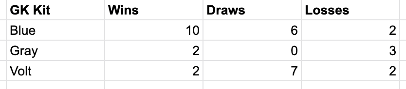 The Blue goalkeeper kits have the most wins for us, while also having a decent number of draws and losses. The Gray jersey has been very hit and miss. Finally, the Volt kit has seen the majority (barely) of our record number of draws.