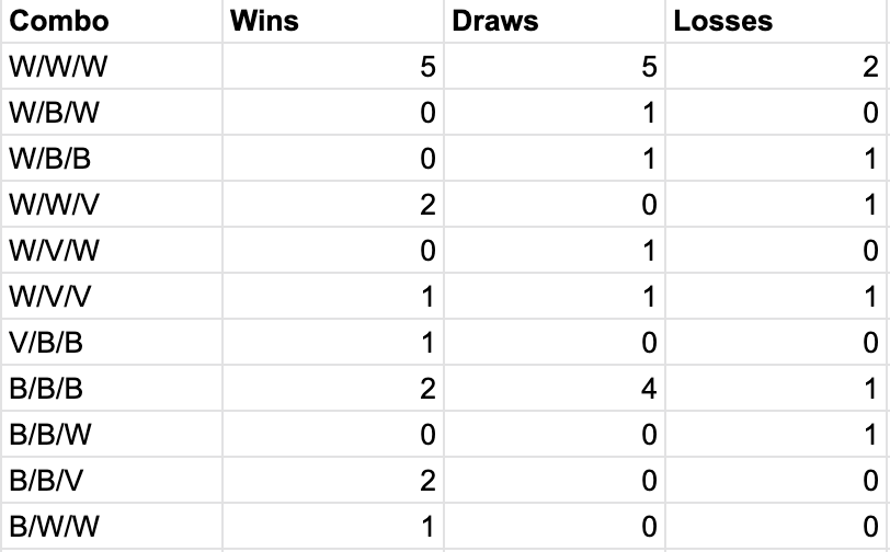 One choice that needs to be made is what to wear. Both for all of the fans heading there (supposed to be a somewhat chilly) as well as the team itself. During the pod this week, there was some discussion of which uniform combination would be good to pick. Earlier in the season when that conversation came up, I did a first update on kit combo records. Well, here’s the updated data on those records (these include Open Cup):
