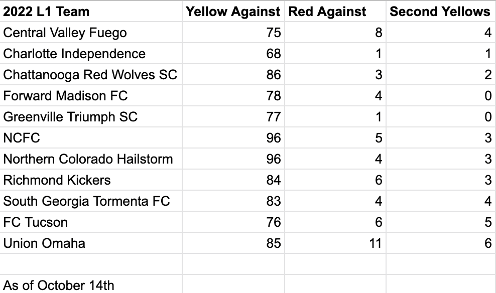 NCFC and NoCo have shot up in yellow cards against. We’re currently in fourth, with Chatt just overtaking us with their wild recent games. Even still, look how many red cards we’ve had against us this year! Double digits! 3 more than Fuego who has had the second most against. About half are straight reds while the others are second yellows. Fuego, NCFC, and Richmond also are right about half and half. It’s curious to see how the other teams lie, with Charlotte, Chatt, Hailstorm, Tormenta, and Tucson being teams that have more second yellows against them while Madison and Greenville have more straight reds. Admittedly in Madison’s case, three of those game in the same weird game against NoCo. I’d be curious to see if the discrepancy here is due to reffing, play style, having a target on your back for some reason, etc., as I’m not sure if there’s an obvious thing that sticks out to me about why it ended up in this distribution. Either way, a curious look at those numbers before the final game of the regular season.