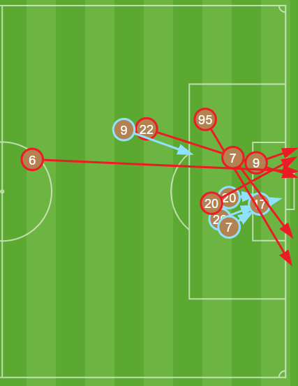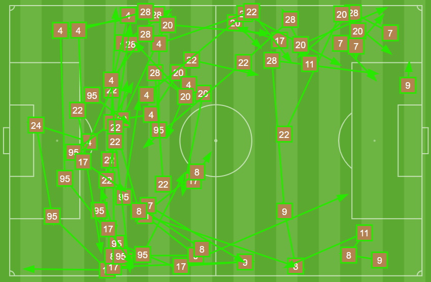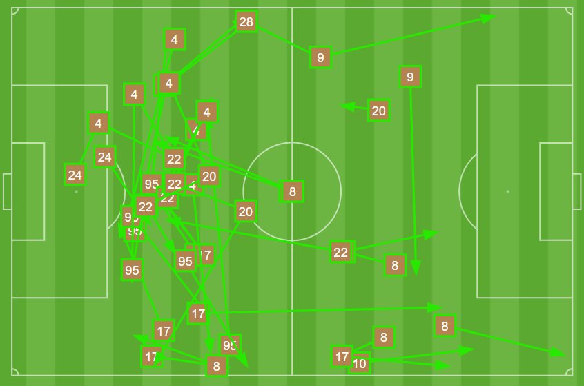 Here’s a field chart with all of the successful passes among Union Omaha players in the first 14 minutes. This continues to display the obvious intent from the Owls to operate their business on the one side of the field: