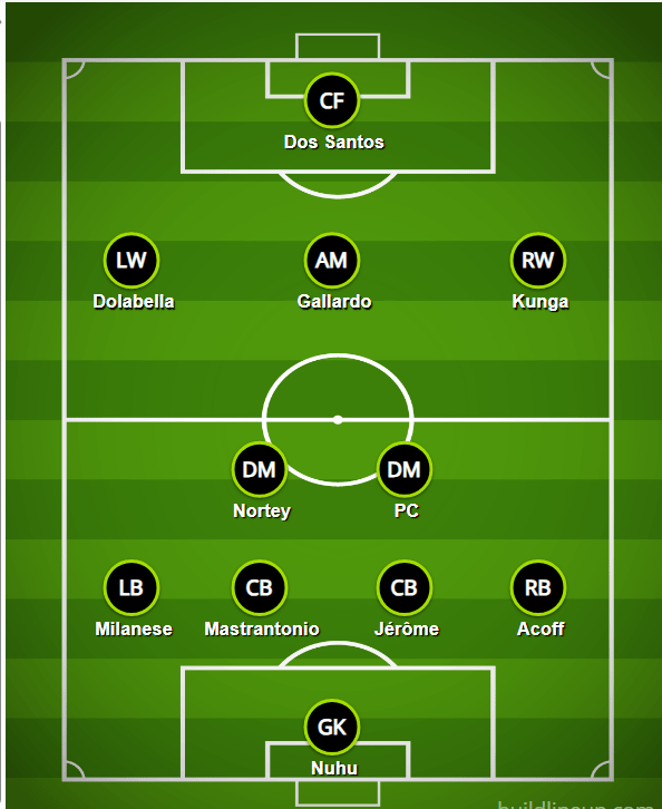 Since all of the above leaves room for only one forward, it’s hard to imagine anybody other than Steevan Dos Santos in that spot. Gómez and Aoumaich on the bench, along with PC and Dolabella’s ability to adapt positionally gives Casciato plenty of flexibility to change formations as needed. I shudder doing this, putting my prognostications on the record in graphic form, but here we go:
