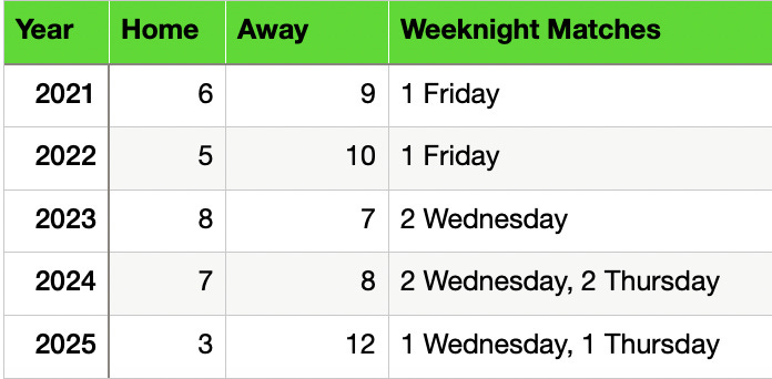 So as the insights wound down, I thought I’d ask one more question about the scheduling overall — the amount of Sunday-Thursday matches scheduled for Union Omaha this year. For context, in addition to two of the three home games mentioned above, the Owls will be playing at home on a “school night” in seven more matches—two on Sunday and five more on Wednesday. This isn’t including any other of such matches, like the season opener in Greenville on Wednesday, March 12 (currently slated for 4 p.m. CT according to FotMob). Midweek matches aren’t usually good “sellable dates,” so it seemed counterproductive.