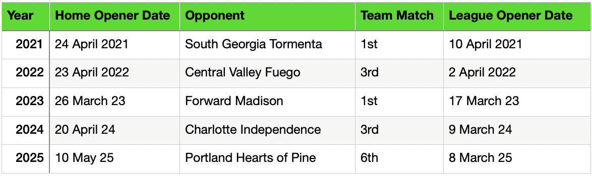 To put that in perspective, the 2024 Búhos started their season on the road against Central Valley Fuego on March 16, then waited almost a month to play their second game at One Knoxville. And still, they managed to get 7 home matches in their first 15 games last season.