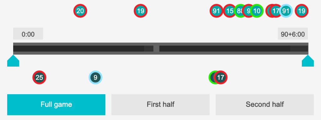 A few things stand out, first is how few passes Jamie had, especially compared to Emir. Clearly the plan was to not make him handle the ball a ton. Probably a good call for someone stepping into the bright lights. The second is the low passing accuracy, I noticed at least two balls passed out of bounds, but the big mistake was aggressively stepping up to close down a player that allowed their forward to get loose.